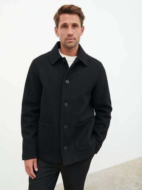 The third product is the Jonah Felted Button-Up Jacket in black, a perfect outer layer to add a bit of structure and warmth to your look. This jacket is designed with a felted texture that gives it depth and a refined feel, while the button-up front makes it easy to put on or take off as needed.