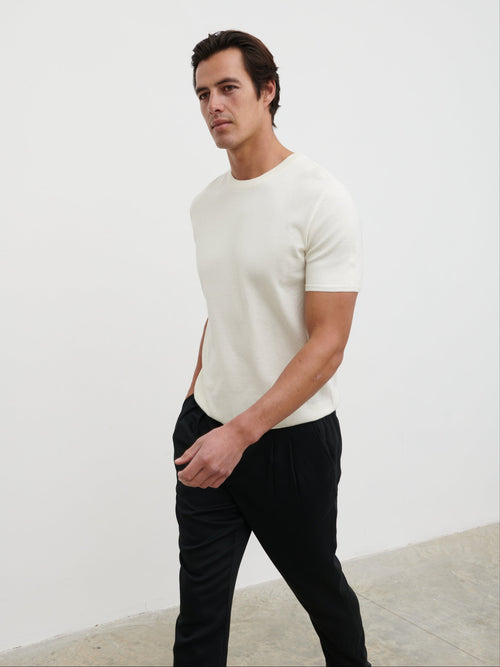 Next is the Teddy Lightweight Knit T-Shirt in cream, a piece that feels soft, comfortable, and surprisingly versatile. A good T-shirt is a wardrobe staple, and this lightweight knit version offers a little more texture and warmth than a basic cotton tee without feeling heavy.